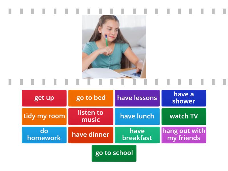do homework, get up, go to bed, go to school, hang out with my friends, have a shower, have breakfast, have dinner, have lessons, have lunch, listen to music, tidy my room, watch TV,