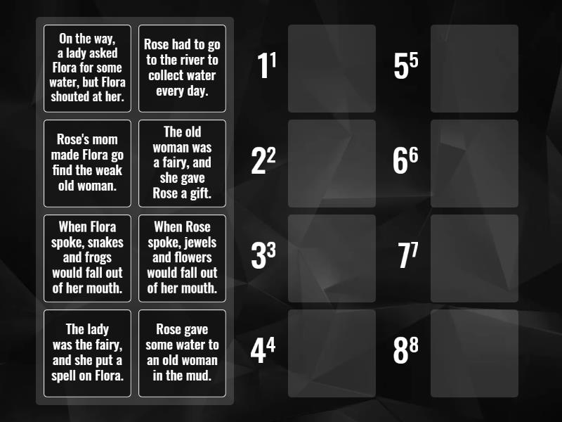 Rose had to go to the river to collect water every day., Rose gave some water to an old woman in the mud. , The old woman was a fairy, and she gave Rose a gift., When Rose spoke, jewels and flowers would fall out of her mouth., Rose's mom made Flora go find the weak old woman., On the way, a lady asked Flora for some water, but Flora shouted at her., The lady was the fairy, and she put a spell on Flora., When Flora spoke,  snakes and frogs would fall out of her mouth..