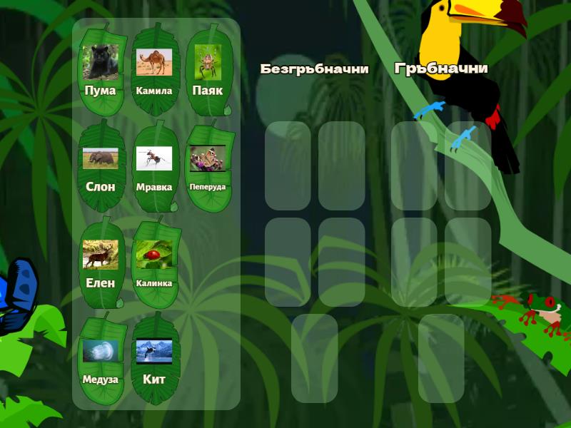 Безгръбначни: Пеперуда, Медуза, Калинка, Паяк, Мравка, Гръбначни: Камила, Елен, Пума, Слон, Кит,