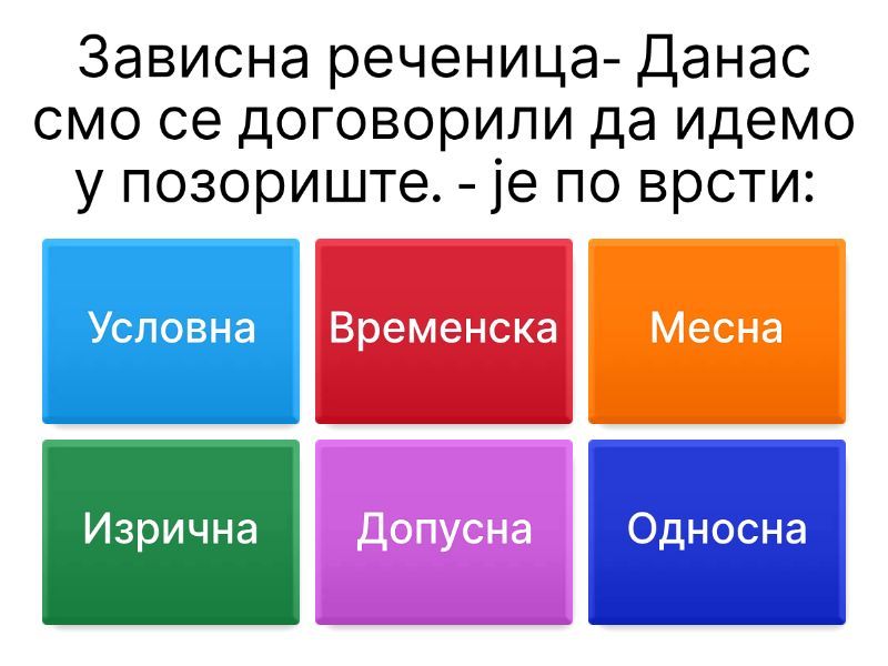 1) Зависна реченица- Данас смо се договорили да идемо у позориште. - је по врсти: a) Условна b) Временска c) Месна d) Изрична e) Допусна f) Односна 2) Независна предикатска реченица  - Ура, победили смо! по комуникативној функцији је: a) Обавештајна b) Упитна c) Заповедна d) Жељна e) Узвична 3) Синтагма - Играјући фудбал, повредио је колено. је по врсти: a) Именичка b) Прилошка c) Глаголска d) Придевска 4) КОлико има предикатских реченица у следећим комуникативним реченицама: Када падне први снег, изађи напоље, помисли жељу и никоме не причај о њој! Да ли си ме чуо? a) 1 b) 2 c) 3 d) 4 e) 5 f) 6 5) Како се назива издвојени глаголски облик у следећој реченици: Када буде звонило, изађи напоље! a) Футур I b) Футур II c) Имперфекат d) Императив e) Перфекат f) Плусквамперфекат 6) Kaко гласи глаголски прилог садашњи? a) Читати b) Читао бих c) Читам d) Читајући e) Читах f) Читао сам 7) Одреди службу извојеног реченичног члана: Онај ранац из излога је прескуп. a) Субјекат b) Именски предикат c) Глаголски предикат d) Прави објекат e) Неправи објекат f) Атрибут 8) Одреди врсту непроменљиве речи: Онај ранац из излога је прескуп. a) Прилог b) Предлог c) Речца d) Узвик e) Везник 9) Одреди врсту напоредног односа међу независним реченицама: Недељом пецамо рибу или идемо на утакмицу. a) Саставни b) Супротни c) Искључни d) Раставни e) Закључни 10) Која се гласовна промене извршила у речи РОЂЕНДАН : a) Непостојано А b) Палатализација c) Јотовање d) Сибиларизација e) Једначење сугласника по звучности f) Промена Л у О