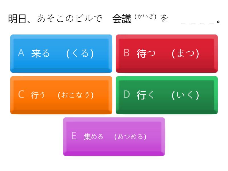 1) 明日、あそこのビルで 会議(かいぎ)を ____。 a) 来る (くる) b) 待つ (まつ) c) 行う (おこなう) d) 行く (いく) e) 集める (あつめる) 2) 飛行機(ひこうき)に 間に合う ように、タクシーを ____。 a) 乗りました (の) b) 聞きました (き) c) 行きました (い) d) 呼びました (よ) e) しました 3) 秋に なると、この辺(へん)の 木の 葉(は)が ____。 a) 落ちる (お) b) 立てる (た) c) 立つ (た) d) 落とす (お) e) 起きる (お) 4) 自分の 小さい(ちいさい) ころを 懐かしく(なつかしく) ____。 a) 立てる (た) b) 取り換える (と)(か) c) 笑う (わ) d) 思い出す (おも)(だ) e) 泣く (な) 5) 近所(きんじょ)の 人(ひと)は、ゴミを ____ 周り(まわり)を きれいに して くれました。 a) 持って (も) b) 調べて (しら) c) 増やして (ふ) d) 選んで (えら) e) 拾って (ひろ) 6) 5 ____ 3 は 8 です。 a) かける b) 割る (わ) c) 増やす (ふ) d) 足す (た) e) 引く (ひ) 7) 放送(ほうそう)は 長く(ながく) なって、 夜(よる)10時(じゅうじ)まで ____。 a) 包みました (つつ) b) 見つかりました (み) c) 続きました (つづ) d) 終わりました (お) e) 始まりました (はじ) 8) 今朝(けさ)、氷(こおり)の 上(うえ)で ____、 軽い(かるい) けがを して しまった。 a) 運んで (は) b) 回って (まわ) c) 育てて (そだ) d) 投げて (な) e) 滑って (すべ) 9) もう 5年(ごねん) 日本に 住んで(すんで)いるので、 だいぶ 文化(ぶんか)に ____ きました。 a) 喜んで (よろこ) b) 太って (ふと) c) 急いで (いそ) d) 慣れて (な) e) 上がって (あ) 10) 来週(らいしゅう)レッスンを 休みたいと 先生(せんせい)に ____。   (dúvida) a) 向かった (む) b) 伝えた (つ) c) 尋ねた (た) d) 思った (お) e) 聞いた (き)