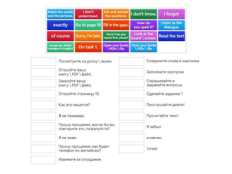 Look at the board \ screen. - Посмотрите на доску \ экран., Open your books \ PDFs \ file. - Откройте вашу книгу \ PDF \ файл., Close your books \ PDFs \ file. - Закройте вашу книгу \ PDF \ файл., Go to page 10 - Откройте страницу 10., How do you spell it? - Как это пишется?, I don't understand. - Я не понимаю., Sorry? Can you repeat that, please? - Прошу прощения, могли бы вы повторите это, пожалуйста?, I don't know. - Я не знаю., Excuse me. What's телефон in English? - Прошу прощения, как будет телефон по-английски?, Sorry, I'm late. - Извините за опоздание., Match the words and the pictures. - Соедините слова и картинки, Fill in the gaps. - Заполните пропуски, Ask and answer the questions. - Спрашивайте и задавайте вопросы, Do task 1. - Сделайте задание 1, Listen to the dialogue. - Прослушайте диалог, Read the text - Прочитайте текст, I forgot - Я забыл, of course - конечно, exactly - точно,