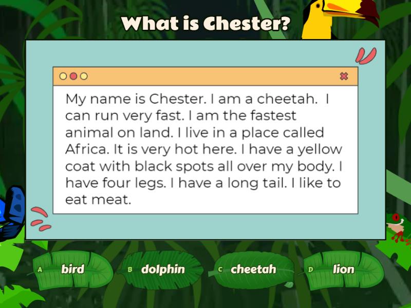 1) What is Chester? a) bird b) dolphin c) cheetah d) lion 2) What colour is Chester's coat? a) orange b) yellow c) pink d) black 3) What can Chester do? a) run fast b) swim fast c) run slow d) fly high 4) Where does Chester live? a) Australia b) Malaysia c) Africa d) India 5) How is the weather in Africa? a) hot b) cold 6) What kind of food Chester likes to eat? a) grass b) meat c) plant d) meat and plant 7) Which animal is the fastest on land? a) bird b) kangaroo c) cheetah d) dolphin 8) How many legs does Chester have? a) 2 b) 3 c) 1 d) 4