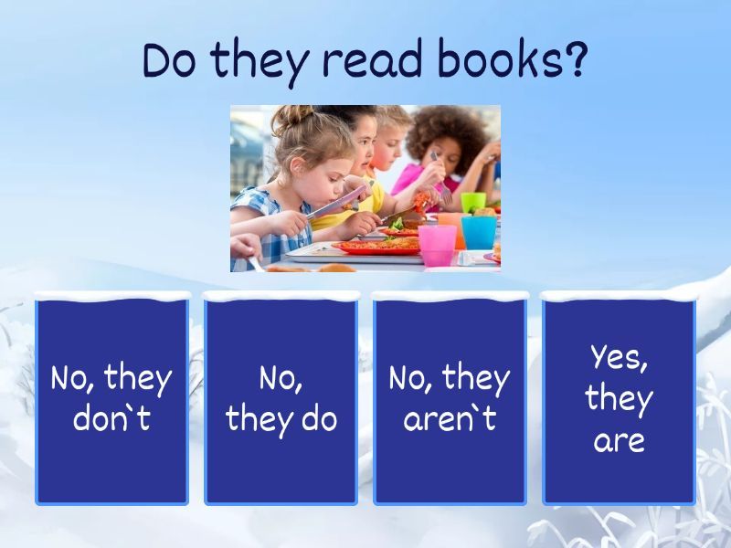 1) Does he listen to music? a) No, he doesn't b) No, I do c) No, he does d) No, he isn't 2) Does she sleep? a) No, she doesn`t b) Yes, she doesn't c) Yes, she does d) Yes, she is 3) Do we go to school? a) Yes, I am b) Yes, we do c) Yes, I go d) Yes, we are 4) Do they read books? a) No, they don`t b) No, they do c) No, they aren`t d) Yes, they are 5) Do Lola and Ann drink milk? a) Yes, they don't b) Yes, they are c) Yes, they do d) No, they aren't 6) Does Tim speak English? a) No, she doesn`t b) Yes, she is c) No, she does d) Yes, she does 7) Do I play football? a) Yes, I don`t b) Yes, we do c) Yes, I do d) Yes, I am 8) Does Julia live in Paris? a) Yes, she do b) No, she doesn't c) No, she is d) No, she isn't 9) Do they watch TV? a) No, they don`t b) Yes, he does c) No, they isn`t d) Yes, they are