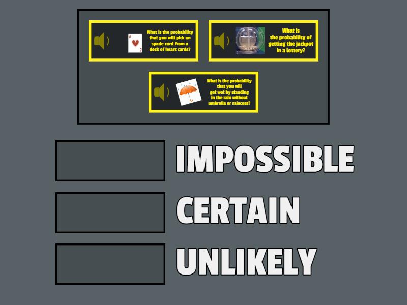 What is the probability that you will get wet by standing in the rain without umbrella or raincoat? - CERTAIN, What is the probability that you will pick an spade card from a deck of heart cards? - IMPOSSIBLE, What is the probability of getting the jackpot in a lottery? - UNLIKELY,