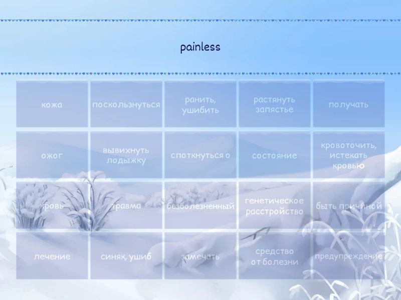 безболезненный - painless, быть причиной - cause, состояние - condition, средство от болезни - cure, лечение - treatment, получать - receive, травма - injury, ранить, ушибить - injure, споткнуться о - trip over, поскользнуться - slip over, кровоточить, истекать кровью - bleed, вывихнуть лодыжку - sprain your ankle, растянуть запястье - sprain your wrist, кровь - blood, синяк, ушиб - bruise, ожог - burn, кожа - skin, замечать - notice, предупреждение - warning, генетическое расстройство - genetic disorder,