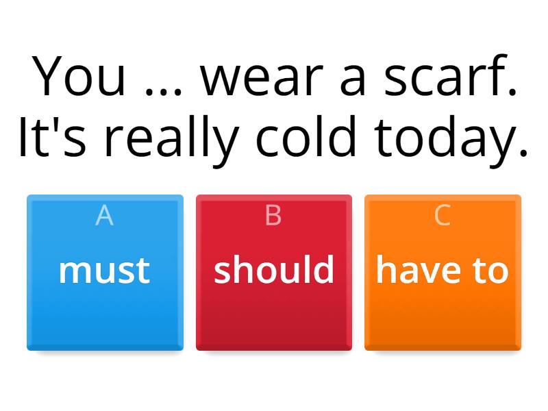 1) You ... wear a scarf. It's really cold today. a) must b) should c) have to 2) We ... go to work next week. It's a holiday.  a) have to b) don't have to  c) mustn't d) shouldn't 3) You ... touch the oven — it's hot. a) have to b) don't have to c) mustn't d) shouldn't 4) Do you ... send a photo with your passport form? a) have to b) don't have to c) mustn't d) should 5) The concert is free. You ... pay. a) have to b) don't have to c) mustn't d) shouldn't  6) I'm late for a meeting. I ... go now. a) have to b) don't have to c) mustn't d) shouldn't e) must 7) You ... leave the door open - the dog will get out.  a) have to b) don't have to c) must d) shouldn't 8) You ... be alone in that part of the city. Get a taxi.  a) don't have to b) shouldn't c) mustn't 9) We ... try that new restaurant in town. a) have to b) don't have to c) must d) shouldn't e) should 10) I ... study this afternoon. I have an exam tomorrow. a) should b) have to c) must 11) You ... go to bed. You look tired. a) should b) have to c) must