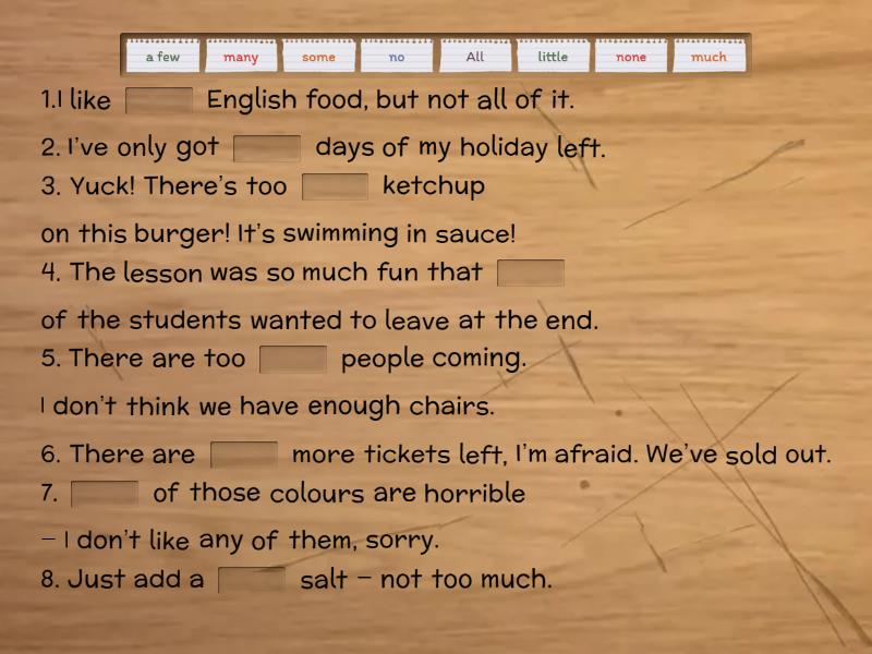 1.I like ____ English food, but not all of it. 2. I’ve only got ____ days of my holiday left. 3. Yuck! There’s too ____ ketchup on this burger! It’s swimming in sauce! 4. The lesson was so much fun that ____ of the students wanted to leave at the end. 5. There are too ____ people coming. I don’t think we have enough chairs. 6. There are ____ more tickets left, I’m afraid. We’ve sold out. 7. ____ of those colours are horrible – I don’t like any of them, sorry. 8. Just add a ____ salt – not too much.