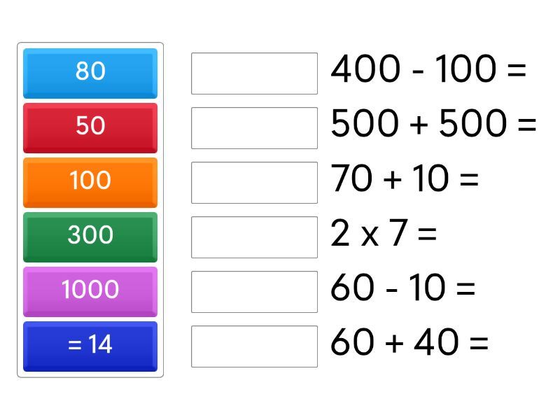 80 - 70 + 10 =, 50 - 60 - 10 =, 100 - 60 + 40 =, 200 - 150 + 50 =, 60 - 30 x 2 =, 40 - 20 + 20 =, 300 - 400 - 100 =, 48 - 8 x 6 =, 1000 - 500 + 500 =, 199 - 200 - 1 =, = 14 - 2 x 7 =,