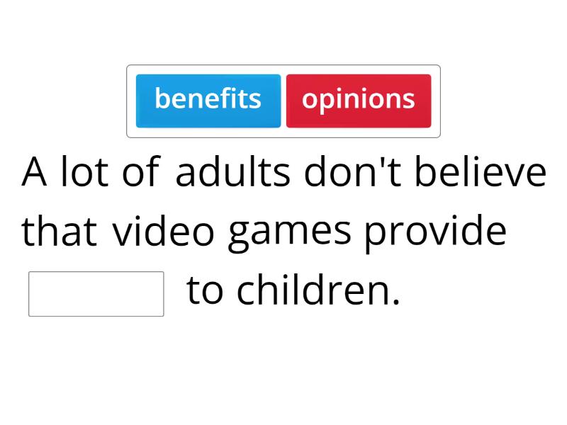 A lot of adults don't believe that video games provide ____ to children. Some of our teachers don't let us express our ____. Scientists are doing a lot of ____ into COVID 19. Some video games cause a lot of ____ because they are too violent. It's sometimes really difficult to make a ____ quickly. I do my best to get good ____ at school as I know it's important for my future. It's a fact that too much fast food has ____ effect on people's health. I hardly ever take ____ in online games. I prefer to play with my dad.