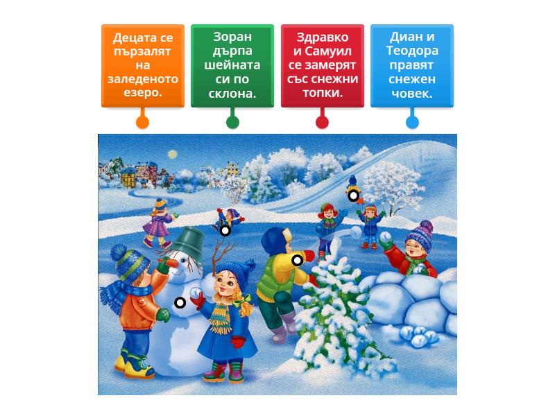 Диан и Теодора правят снежен човек., Здравко и Самуил се замерят със снежни топки., Децата се пързалят на заледеното езеро., Зоран дърпа шейната си по склона..