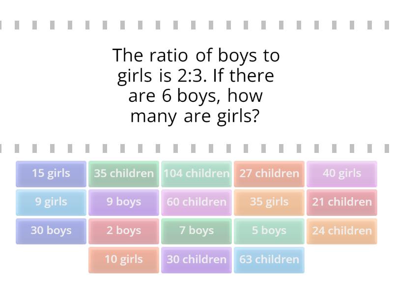 9 girls - The ratio of boys to girls is 2:3. If there are 6 boys, how many are girls?, 2 boys - The ratio of boys to girls is 1:3. If there are 6 girls, how many are boys?, 24 children - The ratio of boys to girls is 1:3. If there are 18 girls, how many children are there in total?, 35 children - The ratio of boys to girls is 3:4. If there are 15 boys, how many children are there in total?, 40 girls - The ratio of boys to girls is 5:8. If there are 25 boys, how many are girls?, 30 boys - The ratio of boys to girls is 5:8. If there are 48 girls, how many are boys?, 104 children - The ratio of boys to girls is 3:10. If there are 24 boys, how many children are there in total?, 10 girls - The ratio of boys to girls is 1:2. If there are 5 boys, how many are girls?, 9 boys - The ratio of boys to girls is 1:3. If there are 27 girls, how many are boys?, 63 children - The ratio of boys to girls is 2:7. If there are 49 girls, how many children are there in total?, 21 children - The ratio of boys to girls is 2:5. If there are 6 boys, how many children are there in total?, 35 girls - The ratio of boys to girls is 4:5. If there are 28 boys, how many are girls?, 7 boys - The ratio of boys to girls is 1:10. If there are 70 girls, how many are boys?, 60 children - The ratio of boys to girls is 5:7. If there are 35 girls, how many children are there in total?, 15 girls - The ratio of boys to girls is 1:3. If there are 5 boys, how many are girls?, 5 boys - The ratio of boys to girls is 1:12. If there are 60 girls, how many are boys?, 27 children - The ratio of boys to girls is 1:2. If there are 18 girls, how many children are there in total?, 30 children - The ratio of boys to girls is 2:3. If there are 12 boys, how many children are there in total?,
