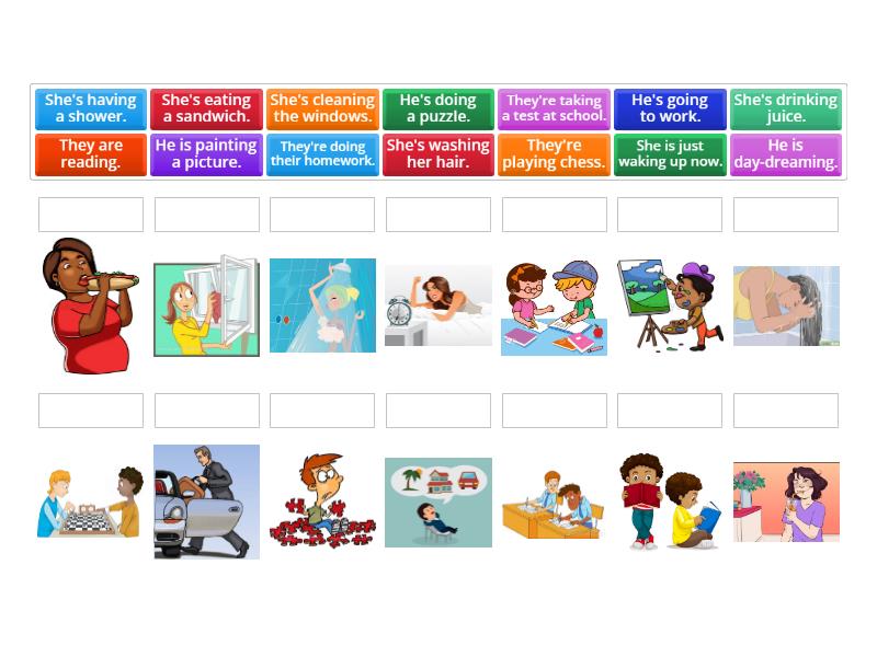 She is just waking up now., He is painting a picture., He is day-dreaming., He's going to work., She's cleaning the windows., She's having a shower., They are reading., She's drinking juice., They're doing their homework., She's washing her hair., They're playing chess., She's eating a sandwich., He's doing a puzzle., They're taking a test at school.,