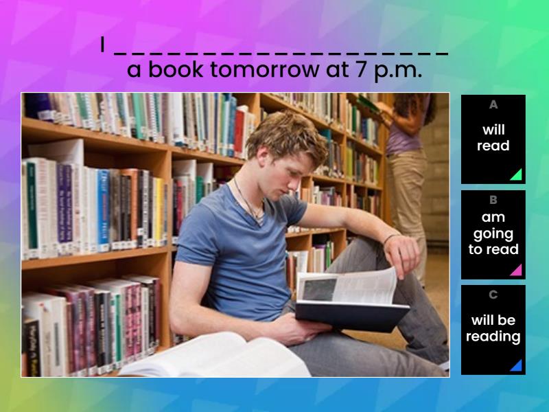 1) I ___________________ a book tomorrow at 7 p.m. a) will read b) am going to read c) will be reading 2) He _______________ fall. Look! a) will b) is going to fall c) will be falling 3) I _____________ you with your homework. Don't worry! a) am helping b) will help c) am going to help 4) It ______________________ .The sky is grey. a) is snowing b) is going to snow c) will snow 5) Are you going to the club today? - I think, I ____________ go there as I have a headache. a) won't b) am not c) will 6) I need your help, please. - Of course, I __________you. a) am helping b) will help c) won't be helping 7) We ________________ computer games. a) will be playing b) are going to play c) won't be play 8) My friends and I __________________ dinner tomorrow. a) will have b) are having c) will be have 9) Let's go shopping. - I can't , I ________________ my first job interview. a) will go to b) am going to c) will be going to 10) This time next year, Paul _____________________ in Paris. a) will work b) will be working c) will have been working 11) By the end of the year, Steve ____________________ in Italy for 5 years. a) will have been working b) will work c) will be working 12) The children _______________________ their homework by 7 o’clock. a) will do b) will have done c) will be doing 13) I’m hungry. I __________________ a sandwich. a) will make b) am going to make c) am making 14) I don’t think Jane _____________________ pass her French exam. a) will pass b) is going to pass c) will have passed 15) When ____________________________ back? - Tomorrow morning. a) will you come b) are you coming c) you are coming 16) By 2018 we ______ (live) in Moscow for 12 years. a) will live b) are going to c) are living d) will have been living 17) He __________ (write) a book by the end of the week. a) will have written b) will write c) is writing d) will have been writing 18) He __________ (write) this book for two hours by 3 o’clock tomorrow. a) will have been writing b) is going to c) will have written 19) __________ (you/ show) me how to use this printer? a) Are you showing b) Will you show c) Will you be showing 20) This time next week I _________ (fly) to Egypt. a) am flying b) will be flying c) will fly d) am going to fly 21) The TV show _______ (start) at 6 p.m. so we've got plenty of time. a) will start b) is starting c) starts 22) This time next week I ________ (attend) the exhibition in London. a) will attend b) will be attending c) will have attended 23) The printer is making strange noises. It ________ (break) down. a) is going to break b) will break c) will be breaking 24) By the end of the year, Tom ________ (work) on this new gadget for 5 months. a) will be working b) will have worked c) will have been working 25) Mr Simmons _________ (make) a presentation of his new robot tomorrow afternoon. a) is making b) will make c) will have made 26) By this time next month, we __________ (complete) our computer course. a) will have been completing b) will have completed c) will complete 27) I ________ (install) a new anti-virus software on your computer as soon as I get home. a) will install b) am installing c) will be installing 28) __________ (buy) Peter a new games console for his birthday? a) Are you buying b) Do you buy