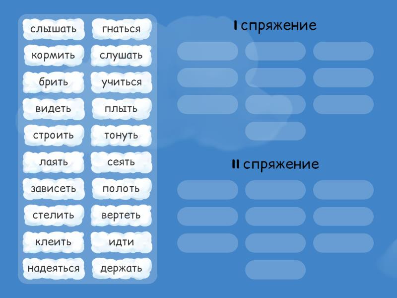 I спряжение: плыть, брить, тонуть, лаять, надеяться, слушать, стелить, сеять, полоть, идти, II спряжение: строить, держать, клеить, слышать, видеть, учиться, вертеть, зависеть, кормить, гнаться,