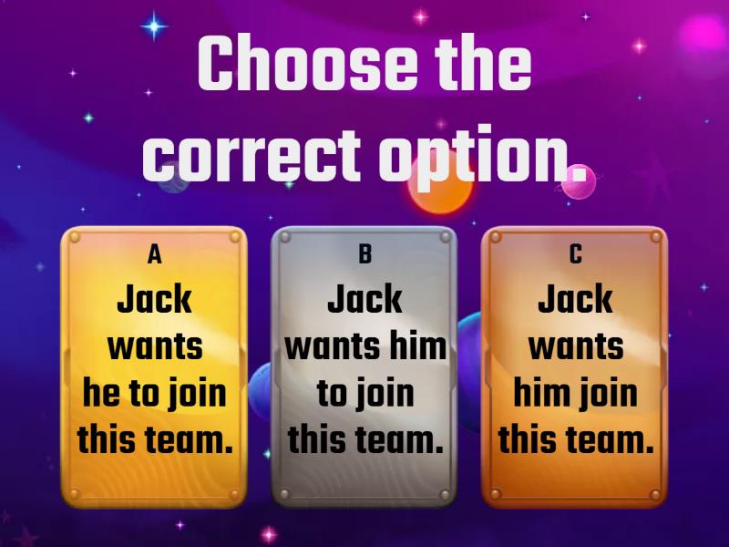 1) Choose the correct option. a) Jack wants he to join this team. b) Jack wants him to join this team. c) Jack wants him join this team. 2) They want ... to win. a) us b) we c) our 3) Choose the correct option. a) Steven wants Liz to move to London. b) Steven wants Liz move to London. c) Steven wants Liz moves to London. 4) Choose the correct option. a) Sarah would like John to propose to her. b) Sarah would like John propose to her. c) Sarah would like John proposes to her. 5) His mum wants him ... his homework. a) to do b) doing c) do 6) Mr. Brown would like his son ... a doctor. a) to become b) becoming c) become 7) I want my son ... more languages. a) learn b) learning c) to learn 8) Я хочу, чтобы ты закрыл окно. a) I would like you to close the window. b) I want you to close the window. c) I want you close the window. 9) Мы ожидаем, что они приедут в среду. a) We expect they to come on Wednesday. b) We expect they come on Wednesday. c) We expect them to come on Wednesday. 10) Лиза не хочет, чтобы он приходил на вечеринку. a) Liz doesn't want him to come to the party. b) Liz doesn't wants him to come to the party. c) Liz doesn't want he to come to the party.