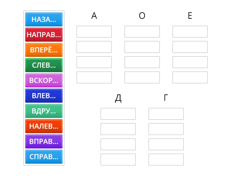 А: СЛЕВ..., СПРАВ..., О: НАЛЕВ..., НАПРАВ..., ВЛЕВ..., ВПРАВ..., Е: ВСКОР..., Д: ВПЕРЁ..., НАЗА..., Г: ВДРУ...,