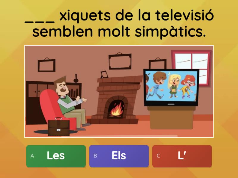1) Estic treballant amb __ microscopi. a) la b) els c) el 2) Necessite mirar en __ llibres de consulta. a) els b) la c) el 3) No veig bé l'hora en __ rellotge.  a) el b) la c) l' 4) __ cotxe és blau. a) El b) L' c) Els 5) Hi ha un niu en __ arbre. a) la b) el c) l' 6) La meua iaia viu en __ edifici d'allí. a) el b) les c) l' 7) Qué còmode és __ silló! a) les b) le c) el 8) ___ xiquets de la televisió semblen molt simpàtics. a) Les b) Els c) L' 9) Per a treballar porte els documents en __ maletí. a) el b) la c) els 10) He de tancar __ finestra que tinc fred. a) le b) la c) l'