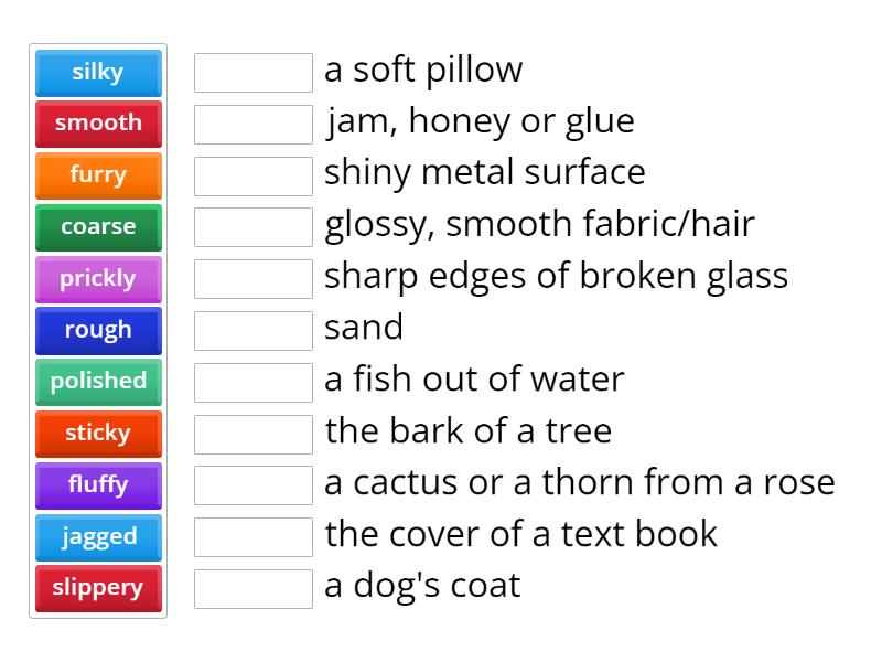 smooth - the cover of a text book, polished - shiny metal surface, silky - glossy, smooth fabric/hair , fluffy - a soft pillow, slippery - a fish out of water, furry - a dog's coat, rough - the bark of a tree, coarse - sand, jagged - sharp edges of broken glass, prickly - a cactus or a thorn from a rose, sticky - jam, honey or glue,