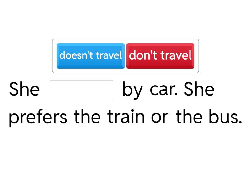 She ____ by car. She prefers the train or the bus. Do you ____ by plane in the summer? Yes, sometimes. When I visit my family in England. I ____ the bike every day after work. Does your partner ____ to work by train? He ____ to work on foot. Does your partner ____ to work by taxi? My friend ____ his car well. Does he ____ riding his bike?