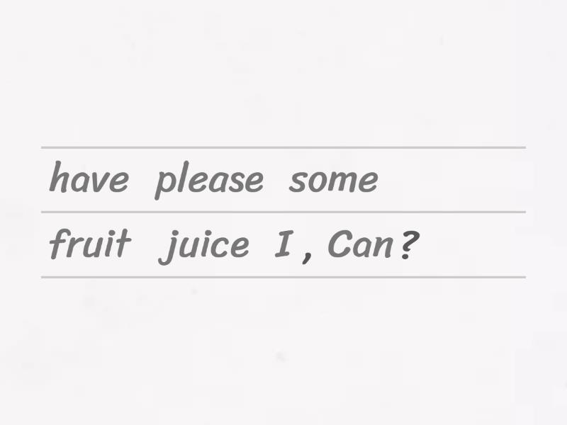 Can I have some fruit juice, please?, Can I have some brown bread, please?, Can I have some apples and bananas, please?, Can I have some milk, please?, Can I have some chocolate cake, please?, Here you are., Can I have some fish and chips, please?, Can I have some rice, please?, Can I have some white bread, please?, Can I have some tomatoes, please?,