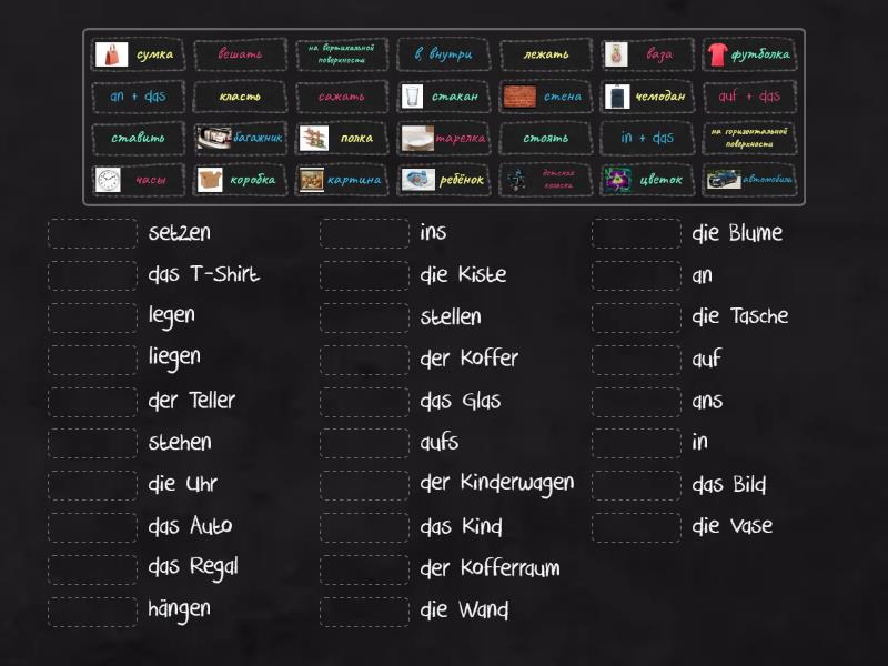 класть - legen, лежать - liegen, ставить - stellen, стоять - stehen, сажать - setzen, вешать - hängen, на горизонтальной поверхности - auf, на вертикальной поверхности - an, в, внутри - in, in + das - ins , an + das - ans, auf + das - aufs, цветок - die Blume, стакан - das Glas, тарелка - der Teller, ваза - die Vase, чемодан - der Koffer, футболка - das T-Shirt, сумка - die Tasche, багажник - der Kofferraum, коробка - die Kiste, ребёнок - das Kind, детская коляска - der Kinderwagen, автомобиль - das Auto, часы - die Uhr, стена - die Wand, полка - das Regal, картина - das Bild,
