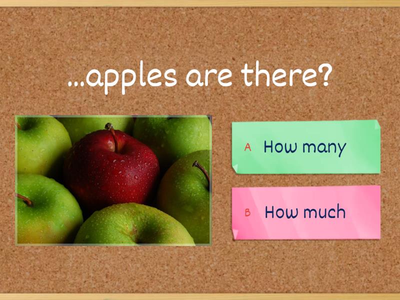 1) ...apples are there? a) How many b) How much 2) ... potatoes are there? a) How many b) How much 3) ...cheese is there? a) How many b) How much 4) ...salt is there? a) How many b) How much 5) ...flour is there? a) How many b) How much 6) ...presents are there? a) How many b) How much 7) ...juice is there? a) How many b) How much 8) .... sweets are there? a) How many b) How much 9) ...sugar is there? a) How many b) How much 10) ...apricots are there? a) How many b) How much