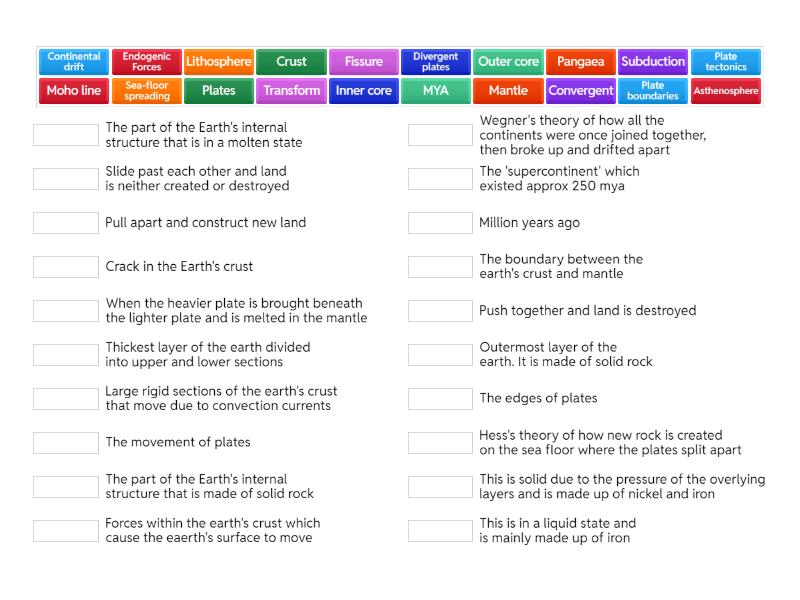 Crust - Outermost layer of the earth. It is made of solid rock, Mantle - Thickest layer of the earth divided into upper and lower sections, Outer core - This is in a liquid state and is mainly made up of iron, Inner core - This is solid due to the pressure of the overlying layers and is made up of nickel and iron, Lithosphere - The part of the Earth's internal structure that is made of solid rock, Asthenosphere - The part of the Earth's internal structure that is in a molten state, Moho line - The boundary between the earth's crust and mantle, Plates - Large rigid sections of the earth's crust that move due to convection currents, Plate tectonics - The movement of plates, Continental drift - Wegner's theory of how all the continents were once joined together, then broke up and drifted apart, Sea-floor spreading - Hess's theory of how new rock is created on the sea floor where the plates split apart, Plate boundaries - The edges of plates, Divergent plates - Pull apart and construct new land, Convergent - Push together and land is destroyed, Transform - Slide past each other and land is neither created or destroyed, Fissure - Crack in the Earth's crust, MYA - Million years ago, Subduction - When the heavier plate is brought beneath the lighter plate and is melted in the mantle, Endogenic Forces - Forces within the earth's crust which cause the eaerth's surface to move, Pangaea - The 'supercontinent' which existed approx 250 mya,