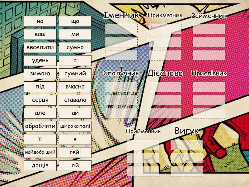 Іменник: дощів, серця, зимою, Прикметник: найдобріший, сумний, широкополі, Займенник: ваш, ми, її, Сполучник: а, але, що, Дієслово: ставало, веселити, обробляти, Прислівник: удень, вчасно, сумно, Прийменник: на, в, під, Вигук: ай, ой, гей!,