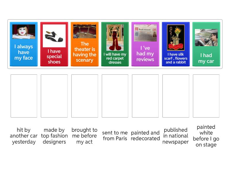 I will have my red carpet dresses - made by top fashion designers, I have special shoes - sent to me from Paris, I always have my face - painted white before I go on stage, I have silk scarf , flowers and a rabbit - brought to me before my act, I 've had my reviews  - published in national newspaper, I had my car - hit by another car yesterday, The theater is having the scenary   - painted and redecorated ,