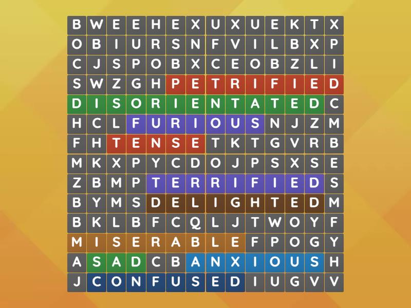 sad, terrified, petrified, anxious, delighted, confused, miserable, disorientated, furious, tense,