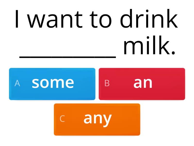 1) I want to drink _________ milk. a) some b) an c) any 2) Jake doesn't like to eat __________ apples. a) an b) any c) some 3) Do you want ________ juice? a) any b) some c) an 4) There is _________ watermelon in the fridge. a) some b) any c) a 5) Is there ________ sugar on the table? a) any b) some c) a 6) ____________ water is in the glass? a) How b) How many c) How much 7) His cousin always eat ___________ cereal for breakfast a) much b) many c) a 8) I sometimes drink _________ coffee in the morning. a) many b) any c) some 9) _____________ melons have we got in our bag? a) How much b) How many c) How 10) My family likes to eat ________ eggs for dinner. a) much b) any c) some 11) ____________ rice do you want? a) How many b) How c) How much 12) Give me ___________ butter, please! a) any b) some c) a 13) I need __________ flour to cook that pie. a) many b) much c) a 14) Nick always buys ____________ bread and __________ milk. a) some, any b) any, some c) some, some 15) Sue doesn't eat _________ bread. a) some b) many c) any 16) My mom always cooks soup with ____________ carrots. a) a b) some c) much 17) There are ___________ biscuits in the sweetbox. a) ten b) one c) a 18) There is not __________ milk in your tea. a) a b) some c) any 19) How ____________ cucumbers do you want to buy? a) many b) much c) any 20) Sarah needs ___________ milk. a) 3 bottles of b) 3 pieces of c) 3 bags of