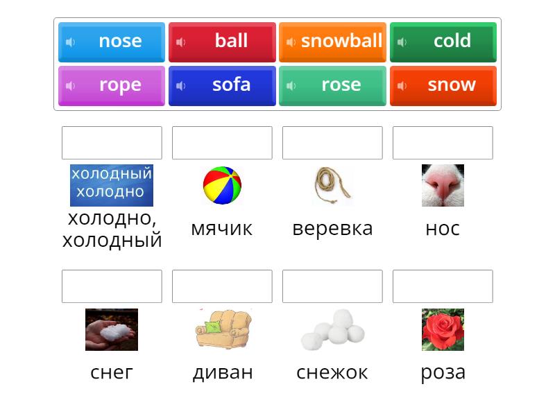 sofa - диван, nose - нос, snow - снег, rope - веревка, snowball - снежок, rose - роза, ball - мячик, cold - холодно, холодный,