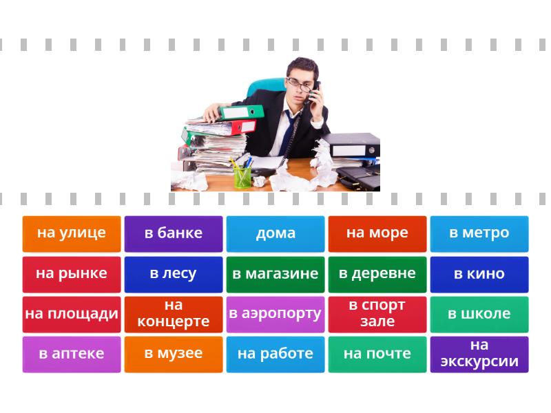 на работе, на площади, в музее, в магазине, в аптеке, в кино, в школе, на море, на экскурсии, в метро, на рынке, на улице, в деревне, в аэропорту, в лесу, на почте, на концерте, в банке, дома, в спорт зале,