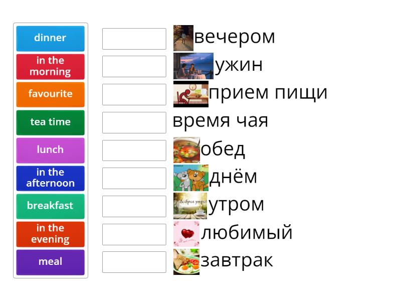 favourite - любимый, meal - прием пищи, in the morning - утром, in the afternoon - днём, in the evening - вечером, breakfast - завтрак, lunch - обед, dinner - ужин, tea time - время чая,