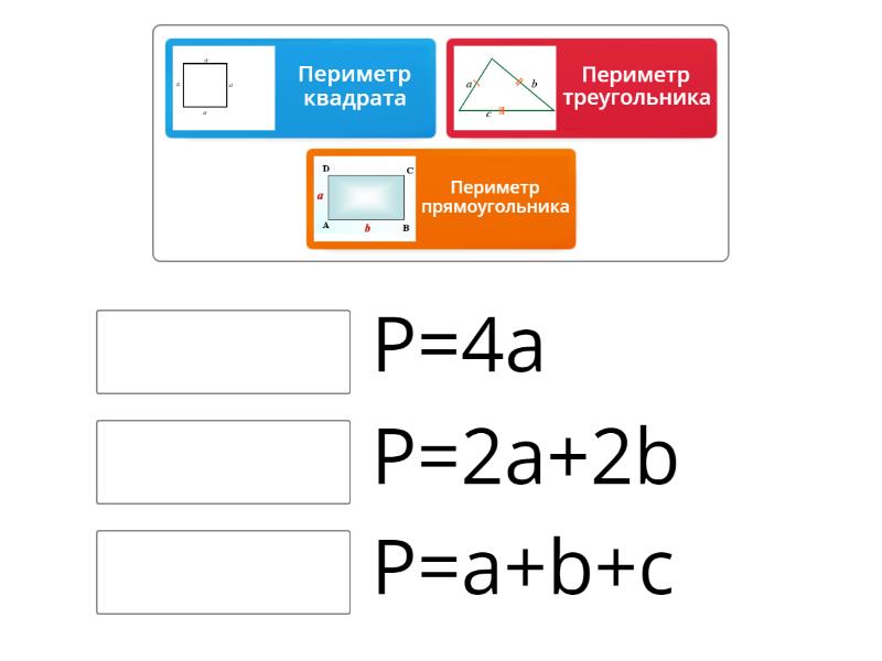 Периметр прямоугольника - P=2a+2b, Периметр квадрата - P=4a, Периметр треугольника - P=a+b+c,