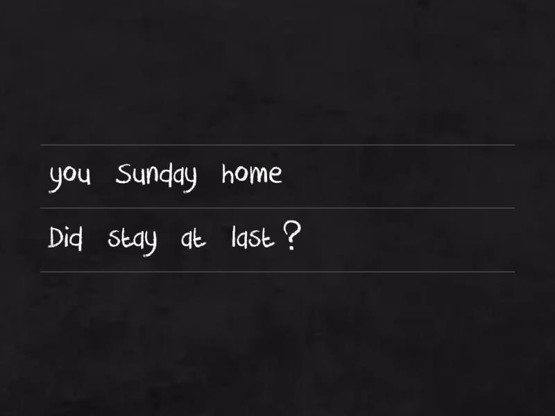 Did you stay at home last Sunday?, Did you visit you friend?, We often played football last year., You didn't play volleyball yesterday., Did you and your friends go for a walk in the park?, They loved to listen to good music last month., Did you like the English lessons last week?, Jane didn't walk from school last Monday., Did Phil study well?, We didn't live in a small house.,