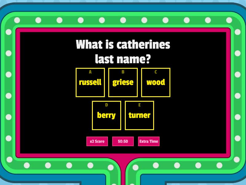 1) What is catherines last name? a) russell b) griese c) wood d) berry e) turner 2) What is gavins last name a) russell b) griese c) wood d) berry e) turner 3) what is camilles last name a) russell b) griese c) wood d) berry e) turner 4) what is Elijahs last name a) russell b) griese c) wood d) berry e) turner 5) what is alloras last name a) russell b) berry c) wood d) turner e) walker 6) what is fias last name? a) turner b) kirsh c) sercy d) brewer e) walker