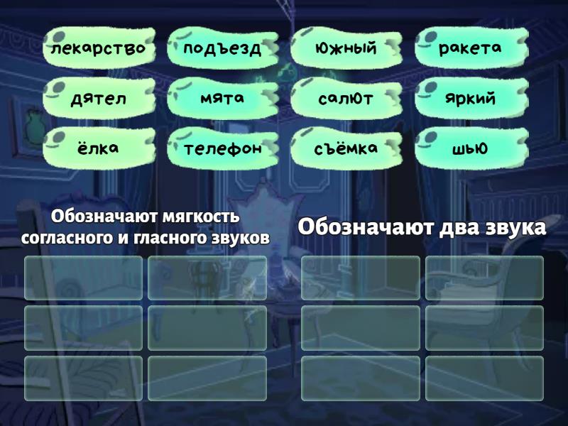 Обозначают мягкость согласного и гласного звуков: дятел, салют, ракета, мята, лекарство, телефон, Обозначают два звука: южный, съёмка, шью, ёлка, подъезд, яркий,
