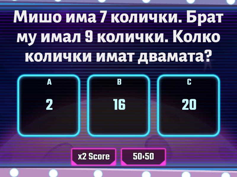 1) Мишо има 7 колички. Брат му имал 9 колички. Колко колички имат двамата? a) 2 b) 16 c) 20 2) Бащата на Мишо има колекция от 11 стъклени топчета. Той подарява 8 на Мишо от тях. Колко топчета са му останали? a) 3 b) 6 c) 1 3) В неделя в близкия парк 3 деца играли баскетбол, 5 деца карали колела и 12 деца карали ролери. Колко деца общо са спортували в парка? a) 18 b) 20 c) 2 4) Димитър и вуйчо му били за риба. Димитър хванал 11 риби, а вуйчо му 8 по-малко. Колко риби хванал вуйчото на Димитър? a) 3 b) 19 c) 13 5) Соня помогнала на майка си. Тя измила 8 чинии и 4 чаши. Колко съда общо е измила Соня? a) 10 b) 4 c) 12 6) Димитър има 8 видео игри, а брат му Стоян има 6 видео игри. Колко видео игри имат двамата? a) 2 b) 14 c) 10 7) Лили имала 19 рибки в един аквариум. Нейният баща преместил няколко рибки в друг аквариум и така останали 11 рибки. Колко рибки преместил баща й? a) 8 b) 10 c) 7