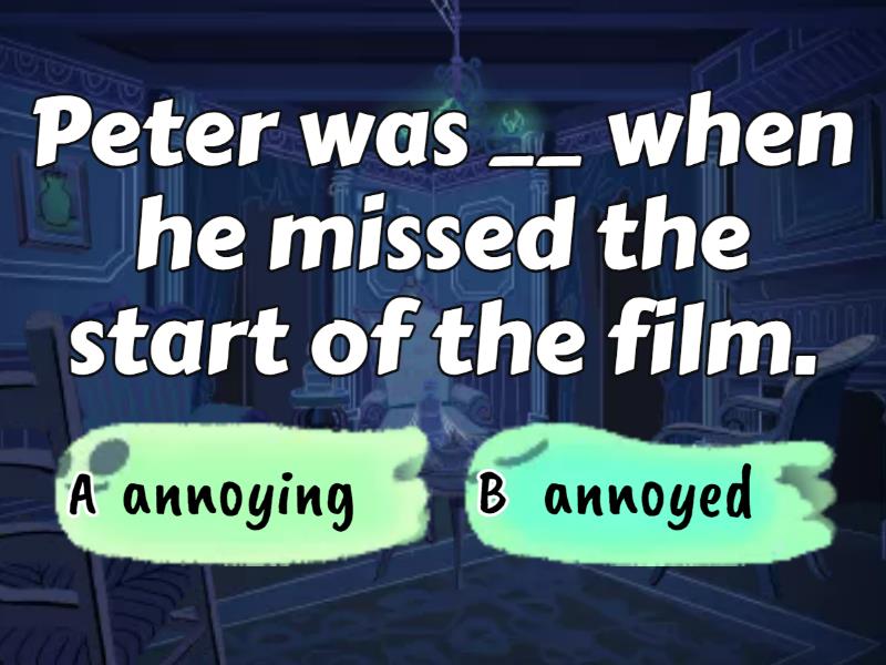 1) Peter was __ when he missed the start of the film. a) annoying b) annoyed 2) Have you read the book 'Life of Pi'? It's a great book, especially if you are __ in that genre. a) interested b) interesting 3) I just can't speak to Tom for more than five minutes. He's the most __ person I know. a) boring b) bored 4) The children were so __ when we told them we were going to Disneyland. a) excited b) exciting 5) Trying to understand English grammar can be so __. a) frustrated b) frustrating 6) John was __ when he went parachute jumping for the first time. a) terrified b) terrifying 7) When there are the sales Sarah is not __ in anything except shopping. a) interested b) interesting 8) I find everything in this mall so ____ a) boring b) bored 9) The lessons make him feel _______. a) tiring b) tired 10) Her experience made her feel _______. a) frightening b) frightened 11) The boy was____ in reading a) interested b) interesting 12) Space science is very ____ to her. a) interested b) interesting 13) The movie was ____. I expected it to be much better. a) disappointing b) disappointed