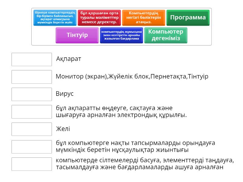 Компьютер дегеніміз - бұл ақпаратты өңдеуге, сақтауға және шығаруға арналған электрондық құрылғы., бұл қоршаған орта туралы мәліметтер немесе деректер. - Ақпарат, Компьютердің негізгі бөліктерін атаңыз. - Монитор (экран),Жүйелік блок,Пернетақта,Тінтуір, Тінтуір - компьютерде сілтемелерді басуға, элементтерді таңдауға, тасымалдауға және бағдарламаларды ашуға арналған, Программа - бұл компьютерге нақты тапсырмаларды орындауға мүмкіндік беретін нұсқаулықтар жиынтығы, компьютердің жұмысына зиян келтіретін арнайы жазылған бағдарлама - Вирус, бірнеше компьютерлердің бір-бірімен байланысып, ақпарат алмасуына мүмкіндік беретін жүйе - Желі,