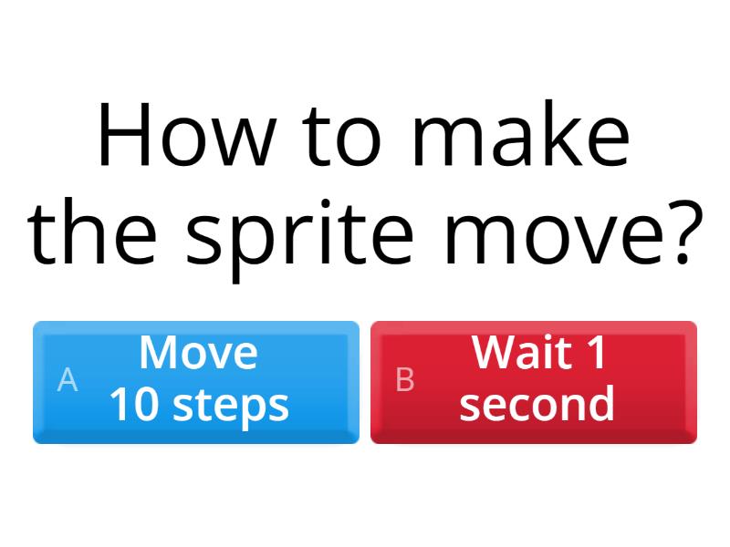 1) How to make the sprite move? a) Move 10 steps b) Wait 1 second 2) How to make the sprite change the costumes? a) Turn 15 degrees b) Next costume 3) How to make the sprite talk? a) Next backdrop b) Say......for.....seconds 4) How to make the sprite stop? a) Wait 1 second b) If on edge,bounce 5) How to make the sprite when touch the edge bounce? a) Think...... b) If on edge,bounce 6) How to make the sound stop? a) Stop all sounds b) Clear sound effects 7) How to choose a sprite? a) Choose a Sprite b) Choose a Backdrop 8) How to choose a Backdrop? a) Choose a Backdrop b) Choose a Sprite 9) How to make the sprite repeat? a) Repeat until..... b) When i start as a clone 10) How to delete a clone? a) Create clone of.... b) Delete this clone