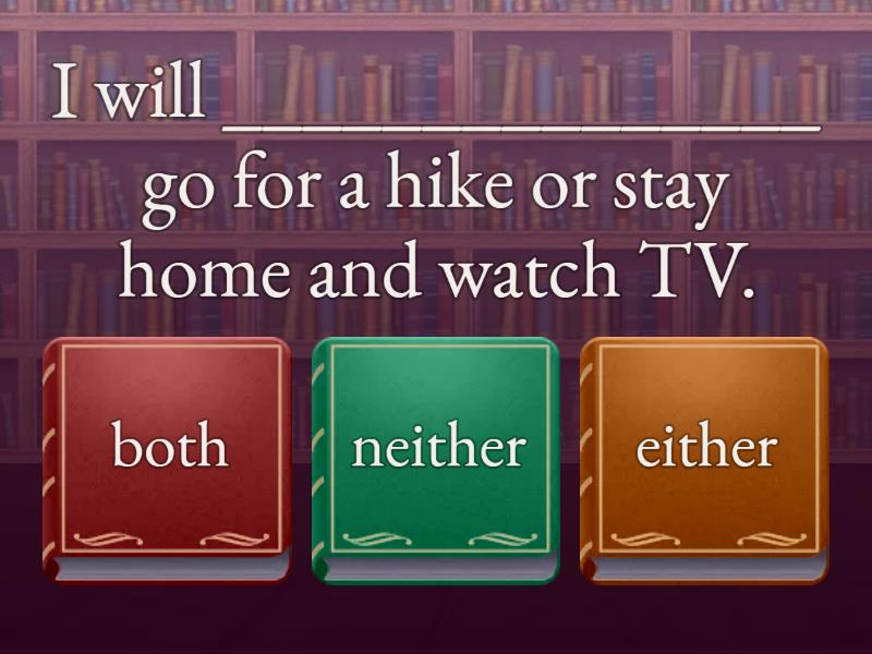 1) I will _______________ go for a hike or stay home and watch TV. a) both b) neither c) either 2) Jerry is _______________ rich nor famous. a) both b) neither c) either 3) She is neither pretty ______ smart. a) and b) or c) nor 4) I want ______________the cheesecake or the chocolate cake. a) both b) either c) neither 5) You want ____________ coffee nor tea? Okay. a) both b) either c) neither 6) _____________ Sophie and Jane enjoyed the movie last night. a) Both b) Either c) Neither 7) ______________ Mike nor the boys are coming to the party. a) Both b) Neither c) Either 8) I would like ________________ the cake or the cookies for dessert. a) both b) neither c) either