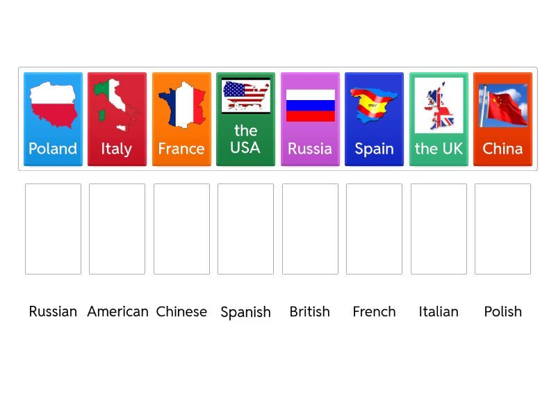 the UK - British, Russia - Russian, Spain - Spanish, France - French, the USA - American, Poland - Polish, China - Chinese, Italy - Italian,