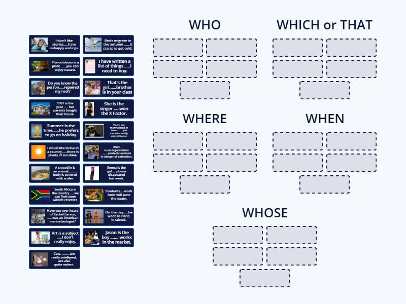 WHO: Jason is the boy ....... works in the market. , She is the singer .....won the X Factor. , Students....work hard will pass the exam. , Do you know the person.....repaired my roof? , Have you ever heard of Rachel Carson, ......was an American marine biologist?, WHICH or THAT: WWF is an organization ........protects animals in danger of extinction. , I don't like stories.....have unhappy endings. , Cats, ........ are really intelligent, are also quite violent. , Art is a subject .....I don't really enjoy. , I have written a list of things .....I need to buy. , WHERE: The outdoors is a place ......you can enjoy nature. , I would like to live in a country......there is plenty of sunshine. , There are many places in town........you can take really nice pictures. , South Africa is the country......we can find some wildlife reserves. , WHEN: 1987 is the year...... her parents bought their house. , Summer is the time......he prefers to go on holiday. , On the day.....he went to Paris, it rained. , Birds migrate in the autumn ......it starts to get cold. , WHOSE: A crocodile is an animal.......... body is covered with scales. , Emma is the girl.....phone disapeared last week. , That's the girl......brother is in your class,