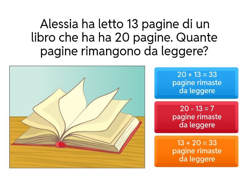 1) Alessia ha letto 13 pagine di un libro che ha ha 20 pagine. Quante pagine rimangono da leggere? a) 20 + 13 = 33 pagine rimaste da leggere b) 20 - 13 = 7 pagine rimaste da leggere c) 13 + 20 = 33 pagine rimaste da leggere 2) In una classe i maschi sono 14 e le femmine sono la metà dei maschi. Quante sono le femmine? a) 14 : 2 = 7 femmine b) 14 x 2 = 28 femmine c) 14 + 14 = 28 femmine 3) In un orto ci sono 5 file di insalata con 6 piantine in ogni fila. Quante piantine ci sono in tutto? a) 6 + 5 = 11 piantine b) 6 X 5 = 30 piantine c) 5 + 6 = 11 piantine 4) La classe seconda D è composta da 19 alunni mentre nella seconda A ci sono 22 alunni. Quanti alunni ci sono complessivamente? a) 22 + 10 = 32 alunni complessivi b) 22 - 19 = alunni complessivi c) 19 + 22 = 41 alunni complessivi 5) La mamma vuole distribuire in parti uguali 24 ciliegie ai suoi 3 figli. Quante ciliegie riceverà ogni figlio? a) 24 : 3 = 8 ciliegie ricevute da ogni bambino b) 3 X 24 = 72 ciliegie ricevute da ogni bambino c) 4 X 3 = 24 ciliegie ricevute da ogni bambino 6) In un acquario ci sono 20 pesciolini. Ne vengono messi 4 in ogni vaso. Quanti vasi occorrono? a) 20 + 4 = 24  Pesci in ogni vaso b) 20 : 4 = 5 Pesci in ogni vaso c) 20 X 4 = 80 Pesci in ogni vaso 7) Samuel ha 12 figurine ma ne vorrebbe il doppio. Quante figurine vorrebbe Samuel? a) 12 X 2 = 24 figurine b) 12 : 2 = 6 figurine c) 12 + 2 = 14 figurine 8) Nella classe di Isabella ci sono 11 bambine e 7 bambini. Quante sono le femmine in più dei maschi? a) 11 + 7 = 18 femmine in più b) 7 + 11 = 18 femmine in più c) 11 - 7 = 4 femmine in più