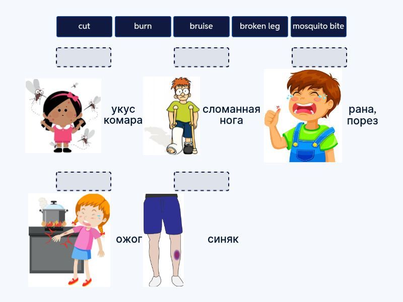 broken leg - сломанная нога, bruise - синяк, burn - ожог, cut - рана, порез, mosquito bite - укус комара,