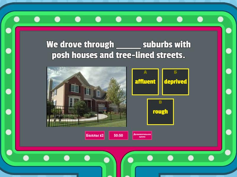1) We drove through ______ suburbs with posh houses and tree-lined streets. a) affluent b) deprived c) rough 2) They live in a _______ building on the East Side. a) hideous b) run-down c) high-rise 3) Tourists are advised to ________ of the area. a) dominate b) steer clear c) knock down 4) This hotel used to __________a casino once. a) house b) renovate c) dominate 5) It's in a/an __________ neighborhood that's undergoing an exciting urban renewal. a) historic b) rough c) up-and-coming