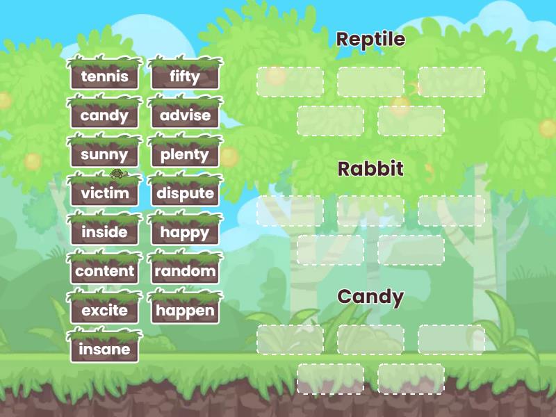 Reptile: insane, inside, advise, dispute, excite, Rabbit: tennis, random, victim, happen, content, Candy: sunny, happy, fifty, plenty, candy,